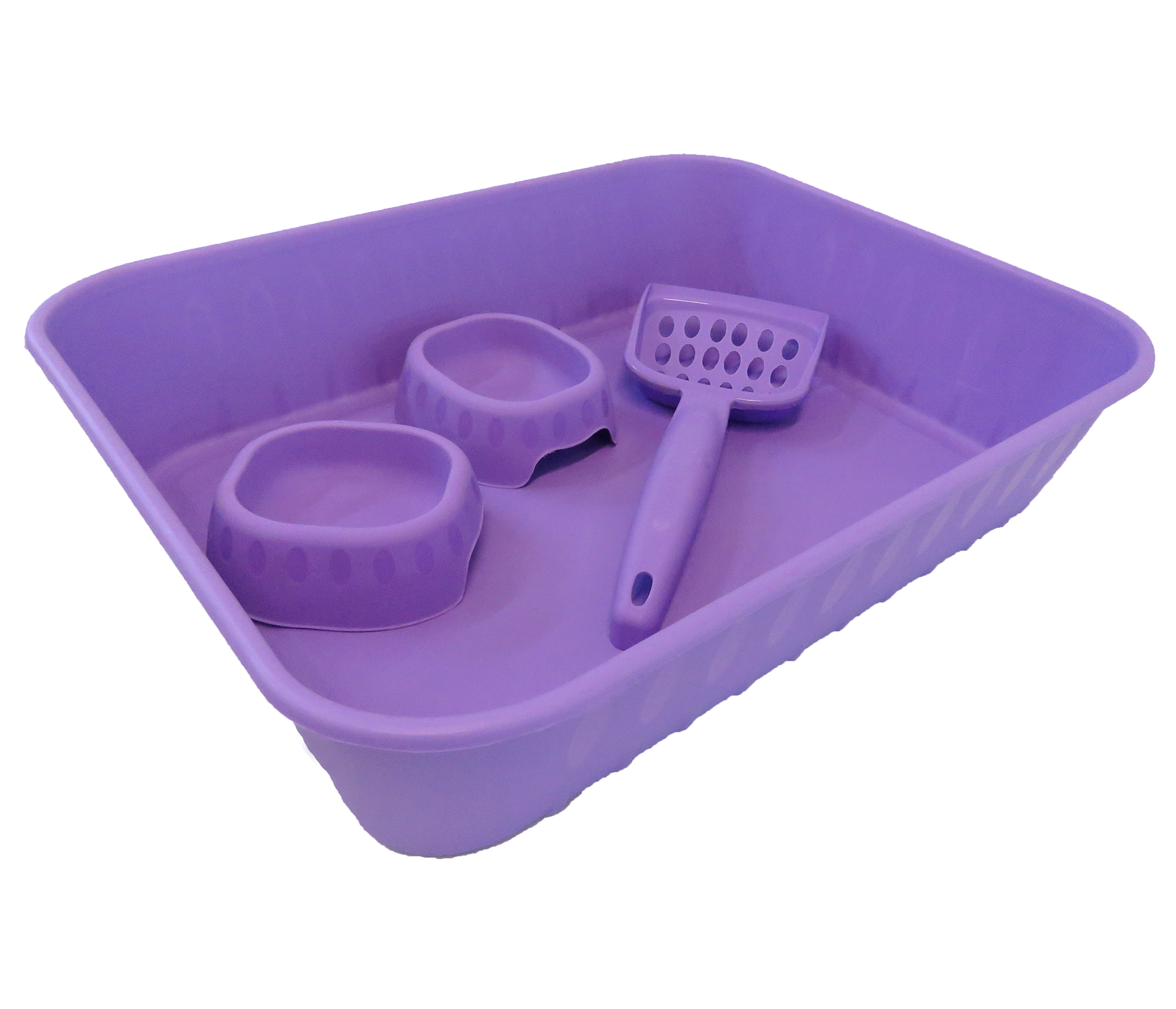 Kit con arenero, pala, comedero y bebedero de colores lila. Medidas 43 x 33 x 9 cm